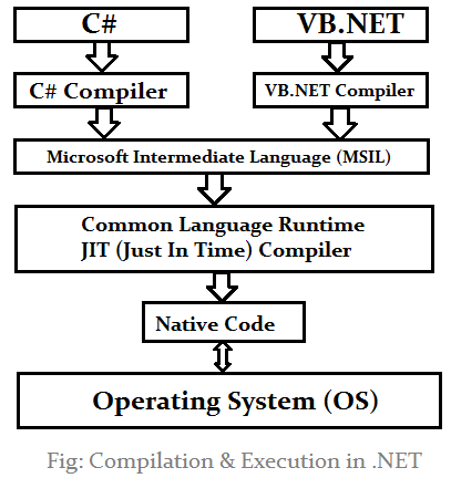 Our code gets compiled two times. On the first pass, it is compiled from higher language (like C#, VB.NET) to MSIL (Microsoft Intermediate Language) by CSC (C# Compiler) or VBC (VB.NET Compiler). On the second pass, the MSIL code is compiled into native code / machine language by CLR which is understandable by the operating system. Only at this point can the OS execute the application. This process is called Just-In-Time JIT compilation because it does not occur until the assembly is on the target machine.