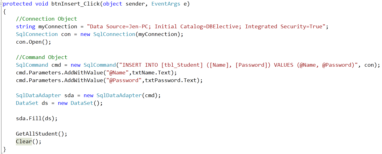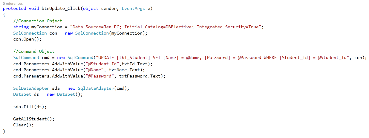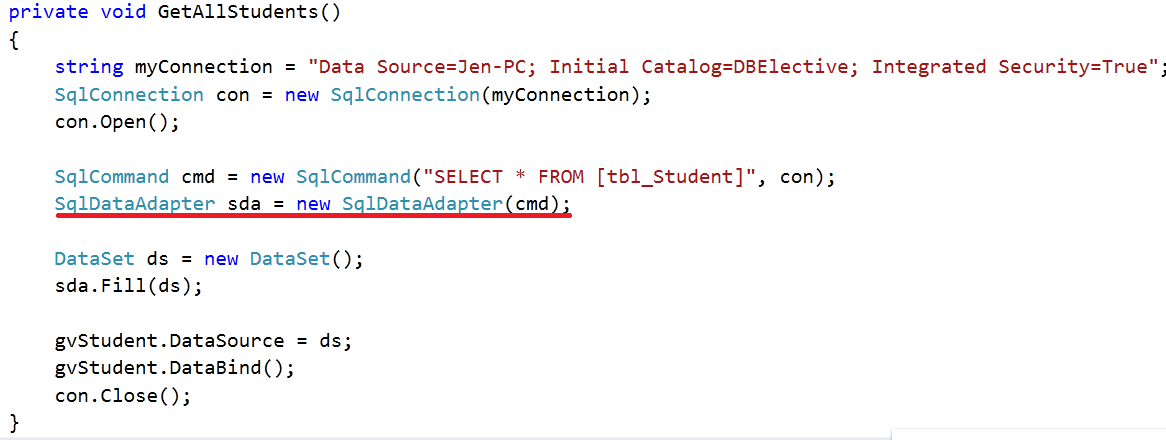 In ADO.NET you communicate with the database through a data adapter (an OleDbDataAdapter, SqlDataAdapter, OdbcDataAdapter, or OracleDataAdapter object). |