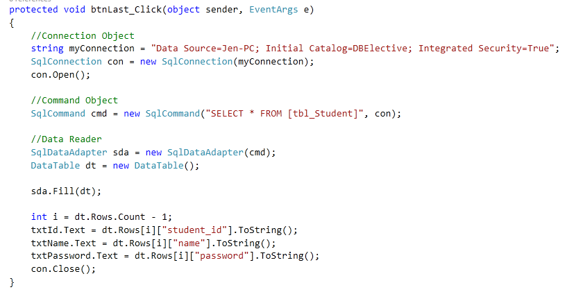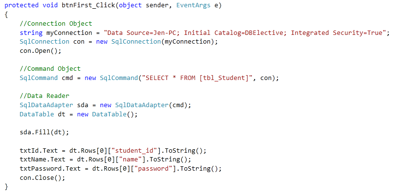 The DataReader object is an alternative to the DataSet and DataAdapter combination. DataReader is used to read the data from database and it is a read and forward only connection oriented architecture. DataReader will fetch the data very fast when compared with dataset. Generally we will use ExecuteReader object to bind data to datareader. To bind DataReader data to GridView we need to write the code like as shown below: