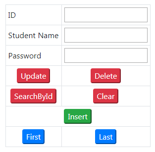 Update, Delete, Search, Clear, Insert, First & Last