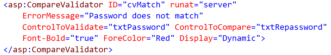 CompareValidator control is used to compare the value of one form field against another field or with a fixed value.