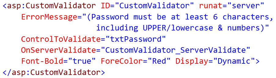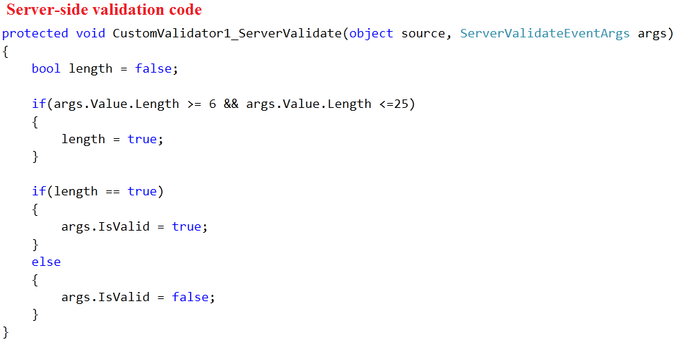 CustomValidator control enables you to create your own validation. The CustomValidator control performs validation, based upon the code, you write. We can write validation code that will be executed on the client side or with server-side validation.